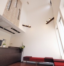 その外観は黒の塗り壁をアクセントにした、黒と白のコンビネーションが映えるモダンなイメージ。吹き抜けとなっている待合室の壁に天井まで届くこだわりのタイルが、天然のぬくもりを感じさせてくれます。爽快感や開放感があふれ、だれもがリラックスできる空間とすることを目指した店舗です。